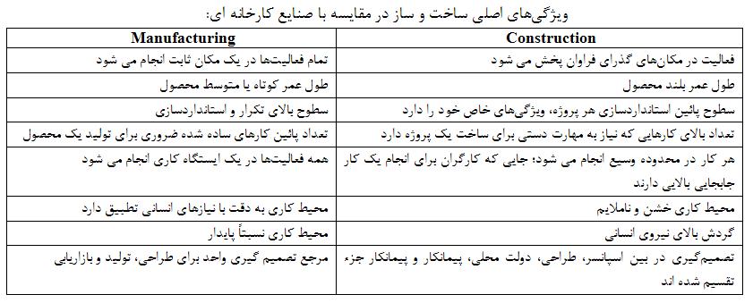در ابتدا باید تفاوتهای بین ساخت و ساز و فرآیند تولید کارخانه ای را مورد توجه قرار دهیم. این تفاوتها را میتوان در جدول زیر دسته بندی کرد . اصلی ترین دلایل ورود با تاخیر و آرام متدهای صنعتی سازی به عرصه ساختمان بوده اند: